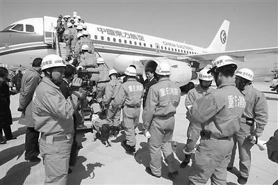 4月15日,西宁机场,来自重庆特勤和消防的100多名救援者准备登机前往玉树地震灾区实施救援。 本报记者 杨登峰摄