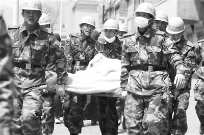 4月16日中午,在玉树灾区,武警官兵把一位刚刚从废墟里发现的幸存者抬往最近的救护车。本报记者 杨登峰 摄