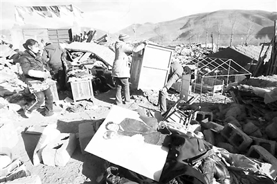 4月16日下午,在玉树地震受灾最严重的结古镇,刚刚结婚不久的藏族小伙索南文色和妻子正在废墟上搭建帐篷。他们在4月10日刚结婚不久就遇到了地震灾害,但他们没有被困难吓倒,而是利用政府发放的帐篷,在自家废墟的边上开始建造新家,他说:“地震已经发生了,生活还要继续的。”