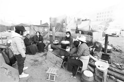 4月16日早晨7点半,在玉树地震灾区的体育场安置点,藏族教师才仁求吉(左三)和自己的亲戚们一起在烧水做早饭。地震发生后,他们全家逃过一劫,15日从废墟里找出了生活必需品,开始自救,这是他们震后做的第一顿饭。由于玉树交通不便,目前各项救援物资正在运往玉树的途中,许多受灾群众开始自救。本报记者 杨登峰 摄