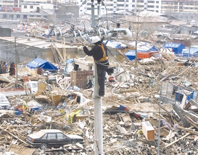 4月17日下午,在玉树地震灾区受灾最严重的结古镇,来自青海送变电工程公司的职工正在加紧铺设线路,争取让灾区早日恢复供电。本报记者 杨登峰 摄