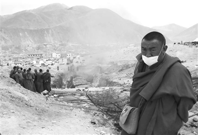 4月17日,是灾后的第3天,按照当地的风俗是遇难者遗体安葬的日子。当地僧俗群众在结古镇的山坡上为部分遇难者火化,数百位僧侣为亡灵诵经超度。