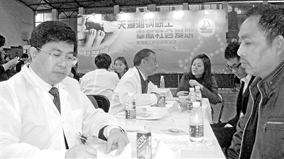 中华医学皮肤性病学分会与西安杨森制药有限公司共同举办的2010“中国护足护肤周”科普宣传公益活动,4月11日在湘潭启动。图为中华医学会广东分会皮肤科学会副主任委员赖维教授与其他专家们在湘钢体育馆为湘钢职工义诊。李静 摄
