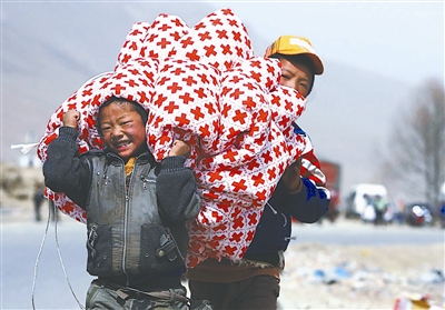 4月18日,在玉树地震灾区最大的受灾群众安置点,藏族小朋友仁青闹布(前)和哥哥永丁朋措一起扛着两床刚刚领到的爱心棉被回家。因气象台预报最近两天玉树可能有降雪,气温会下降,玉树抗震救灾总指挥部增加棉被发放,避免受灾群众因气温下降而生病。本报记者 杨登峰 摄