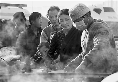 雪域高原的玉树,交通不便,供给缺乏,灾情发生后,当地受灾群众和先期抵达的救援队伍,缺吃少穿,但经过各方的努力,从18日开始救灾部队和社会志愿者陆续在当地的安置点上,架设锅灶,为受灾群众熬粥热饭,全力保障灾区群众生活。