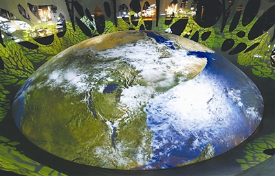 这是城市星球馆内的核心展项“蓝色星球”,直径达30多米的“蓝色星球”采用大型多媒体无缝拼接投影技术,模拟出鸟瞰地球的场景。 新华社记者 裴鑫 摄