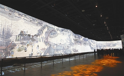 中国馆内的多媒体展项《清明上河图》正在进行放映调试。 新华社记者 裴鑫 摄