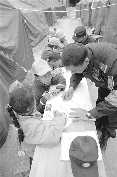 4月19日,在玉树民族中学操场上,罗正义为帐篷小学的学生辅导功课。成都特警罗正义4月14日下午抵达玉树后,立即和同事们投入到紧张工作中。他们在营地所在地、玉树州民族中学建起一个帐篷小学,帮助附近受灾的孩子继续学习。目前共有六名小学生在这所帐篷学校学习。新华社记者 丁海涛 摄