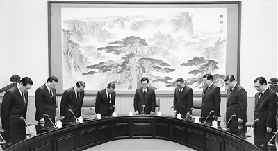 4月21日上午,胡锦涛、吴邦国、温家宝、贾庆林、李长春、习近平、李克强、贺国强、周永康等全体起立,向在青海玉树地震中遇难的同胞默哀。新华社记者 李学仁 摄
