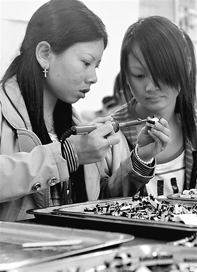 4月20日,四川省华蓥市蓝艺职业技术培训中心的实训老师,在手把手地向刚接受完理论培训的农民工传授操作技术。四川省华蓥市针对本地用工需求特点,由政府主导,工会、劳动就业、劳务管理部门及用工企业联合,分期分批对农民工进行免费订单式培训,让农民工带着一技之长在家乡再就业。邱海鹰 摄