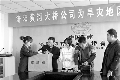 4月17日,铁建十五局集团分布在全国212个项目工地,为旱灾地区举办“献爱心,助灾区”捐款活动。当日,干部职工捐款近五万元。图为济阳迎宾黄河大桥公司员工为灾区捐款的情景。