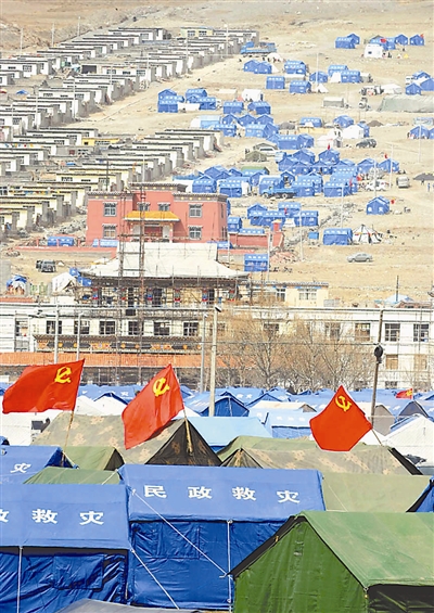 青海玉树地震发生后,各级政府将数万顶救灾帐篷运进地震灾区结古镇,安置灾区群众,集中连片的帐篷使雪域深处的高原重镇成为壮观的“帐篷城”。