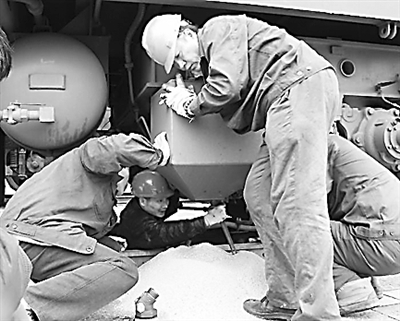“4月21日,武昌南机务段检修车间电力行检3班毛升安因取得连续安全检修机车达2000台而荣登路局“百台赛”光荣榜。在日常工作中,勤学善思的毛升安摸索、总结出机车检查“听、看、摸、闻、敲”五字工作法,并靠此准确诊断机车问题、修复问题。这是在五一节前夕,毛升安(中)与工友一起处理机车砂箱故障。袁甫 赵帅民 摄