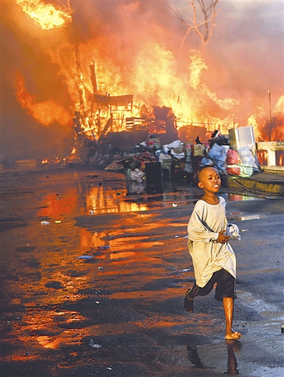 4月25日,在菲律宾奎松市,一名儿童逃离火灾现场。据当地媒体报道,奎松市25日发生火灾,至少300间民房被烧毁。 新华社发(路易斯摄)