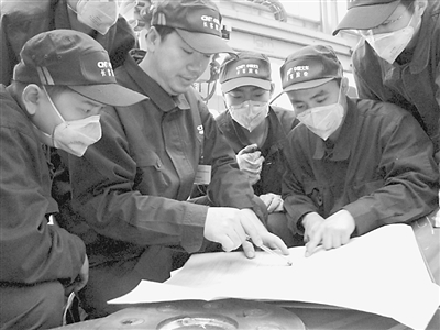 谢元立(左二)在班组指导工作