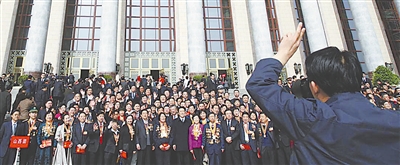 4月27日上午,来自山西的劳模代表在摄影师的指挥下在人民大会堂门前合影。