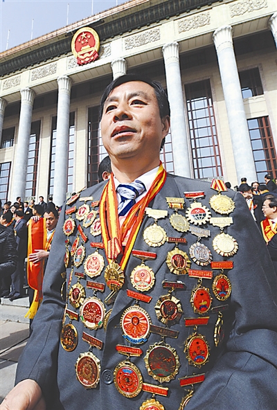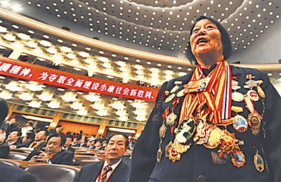 4月27日上午,胸前挂满奖章的申纪兰作为特邀代表出席表彰大会。