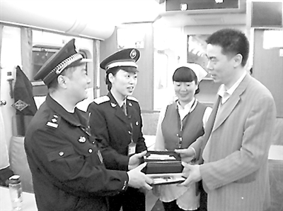 T9次运行在邢台至邯郸间,餐车主任李朝玉在收拾碗盘的时候拾到一个黑色的男式手包,立即将包交给了列车长陈斌和乘警石学富。在餐车询问查找无人认领后,广播查找失主,约5分钟后,2名男性旅客赶到餐车前来认领,经乘警确认证实了失主的身份后将手包归还失主,耿海军拿着失而复得后的手提包,看着里面的重要资料一点没动,激动地当场要重金酬谢,然而被列车长微笑着婉言谢绝了!