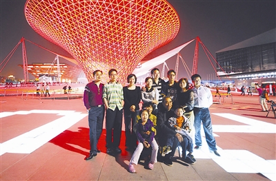 5月2日20时18分,家住上海普陀区建德花园小区的上海市民张小苑一家12口人在逛了一天世博园之后,在世博轴下合影留念。张小苑说:“世博会精彩纷呈让我们全家震撼,生活在当今的中国真是福气。”