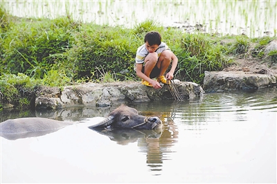 5月2日,在广西柳江县成团镇莲花村,一头水牛在田边的小溪里泡澡。