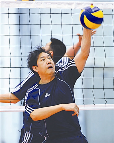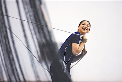 5月1日,中国女排主教练王宝泉的女儿王茜在训练中拉网绳。当日,在福建漳州集训的新一届中国女排训练场上,教练组与队员们在艰苦的训练之余,笑容不时绽放在每个人的脸上,中国女排正在重拾信心,在新的起点上扬帆启航。