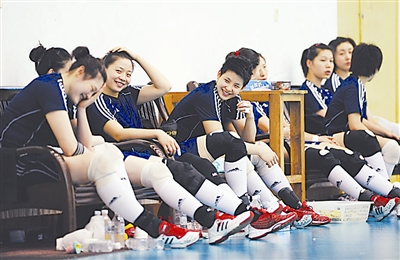 中国女排队员训练间隙在场边休息聊天。 新华社记者 姜克红 摄