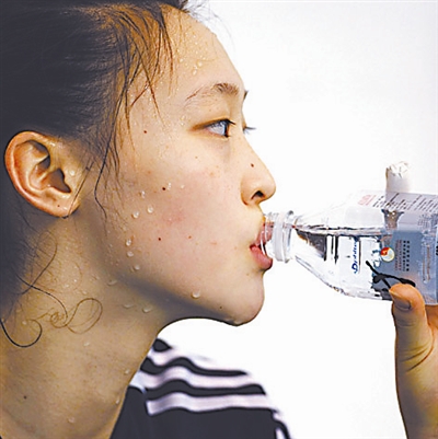 训练间隙喝水的中国女排队员惠若琪满脸汗水。 新华社记者 姜克红 摄