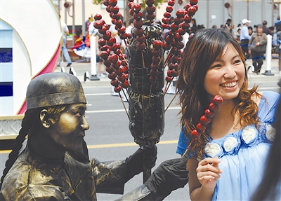 5月4日,在上海世博大道上,一位游客正在拉着卖糖葫芦的模特留影。当日,上海世博园北京周正式拉开帷幕,纯正且精彩的北京文化为世界各国的观众留下了难忘的印象。本报记者 于文国 摄