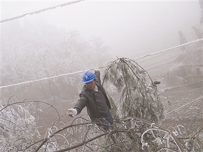 2008年雪凝期间,贵州移动抢修技术人员攀上高枝抢修光缆