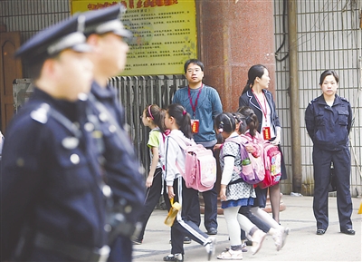 5月5日晨上学时分,多警多岗在洛阳市实验小学门口执勤守护。洛阳巡警、交警、派出所、社区和学校全部上岗,投入校园安保升级。交警延长了之前设置的保障校园门口交通的“护学岗”驻守时间;市巡警支队、派出所、社区分别给辖区内学校、幼儿园安排执勤人员,护送孩子们上下学;学校领导带班、3名值班教师在校门口内外巡视;幼儿园严格执行接送卡制度,家长接送幼儿时持卡方可入园。面对这个场面,家长们笑容满面:“这样放心多了!” 张晓理 摄