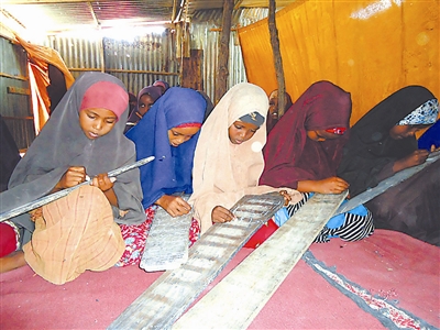 5月6日,索马里首都摩加迪沙,一所小学的女生正在上课,她们用木板当“练习本”写字。