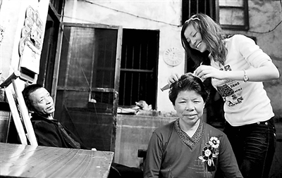 罗桂红在出租屋外的过道里为母亲梳头,父亲在一旁看着。 新华社记者 李尕 摄