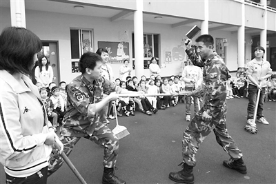 武警江苏扬州边防检查站官兵走进幼儿园,向门卫和老师传授徒手夺菜刀技巧。费伯俊 摄