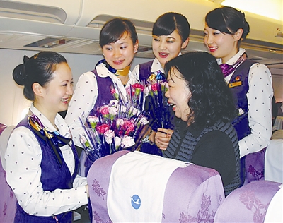 “这是一份意外的温情和惊喜,我们在祖国的蓝天上体验到了节日的快乐,深深感受到了母亲的伟大。”5月9日是母亲节,这天乘坐厦门航空福州分公司MF8108航班北京飞往福州的每一位女性旅客,在万米高空都收到了一束表达对伟大母亲最诚挚节日祝福的康乃馨,顿时客舱里充满欢声笑语。图为乘务长邱稣(左一)带领乘务人员为旅客送上母亲节的祝福。 本报记者 肖玉保 摄