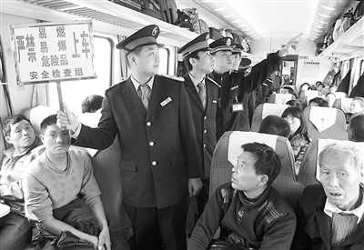 为迎接2010年上海世博会,“红旗列车”K49/50、K279/280次旅客列车成立了一支流动安全检查组。安检组由公安、客运、列检“三乘一体”组成,分别对始发和终到定时检查,旅途中不定时随机检查,把易燃易爆危险品卡控在站外车下。图为“三乘一体”安检组正在车厢内流动作业。