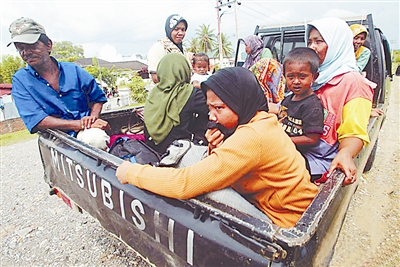 印度尼西亚亚齐特别行政区5月9日发生里氏7.2级地震。印度尼西亚当局已发布海啸预警,但不久后被取消,尚无人员伤亡报告。图为受灾民众乘车撤离灾区。阿健 供图