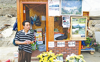 2009年5月6日,在东河口地震遗址上,村民何先通守在自己的亭子旁。震后何先通以售花为生,每天给遇难的妻子张发英献束菊花,默默地陪伴妻子。