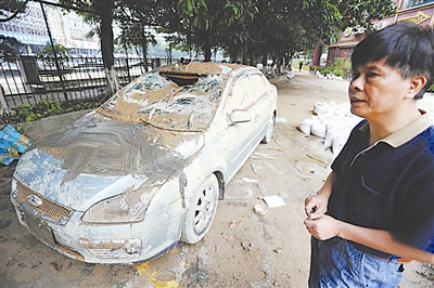 5月11日,市民黄先生在广州大道金穗大厦院内看着自己被水浸破损严重的小车欲哭无泪。5月7日凌晨,广州各区普降大暴雨,给不少居民带来财产损失,也暴露出广州城市建设和管理的薄弱点。专家建议,应提升应急处理能力和建立长效防控机制,做到全局化、系统化防灾救灾。 新华社记者 刘大伟 摄