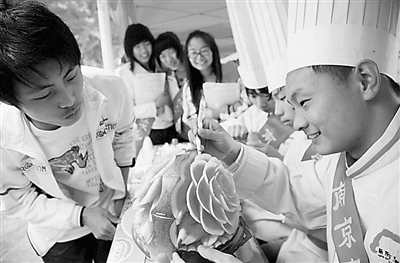 5月9日,南京烹饪技工学校师生现场展示水果雕刻绝活。当日,江苏省和南京市在南京山西路市民广场联合举办技工院校招生宣传和技能展示活动,吸引众多家长带着孩子冒雨前来咨询。据介绍,截至目前,南京市技工院校在校生人数为6.8万人,毕业生平均就业率高达99%以上,为各行各业输送了大量的优秀人才。 钟山 摄