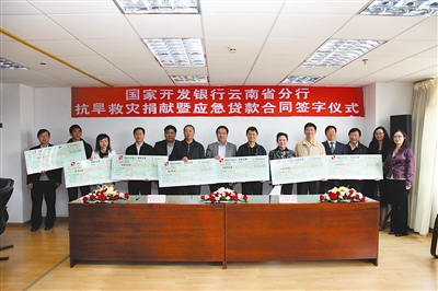 为迎战百年不遇的旱灾,国开行云南分行开设了抗旱救灾信贷绿色通道,通过特殊程序办理应急贷款的发放,最大程度和最快速度满足应对灾害的资金需求。截至目前,累计提供抗旱救灾应急贷款1.2亿元,支持了临沧、曲靖、普洱、楚雄等地的抗旱救灾工作。对应急贷款执行最优惠的利率,使灾区减少利息负担64万元。向昆明、曲靖、楚雄、普洱、临沧等州市和西山区、寻甸县、绿春县等区县累计捐款180余万元(其中员工个人捐款30余万元),救灾物资7000多元。4月14日青海玉树地震发生后,分行员工短短几十分钟内就捐款51200元,第一时间向灾区送去爱心。