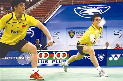 5月11日,中国队选手蔡赟(右)/付海峰在男双比赛中以2比0战胜韩国队选手郑在成/申白植。 新华社记者 张晨 摄