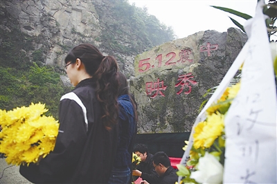 5月12日上午8时许,“5·12”汶川特大地震震中心映秀镇乡镇机关、东莞援建工作组、施工队伍及附近居民在“大爱磐石”处开展纪念及献花活动。 孤岛 摄