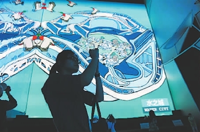 在上海世博园区浦西展区的城市最佳实践区城市未来馆中,参观者在感受未来城市发展的几种状态。这是一位游客在“水之城”案例前留影。本报记者 张宪 摄