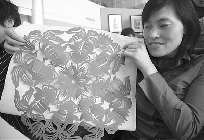 5月13日,在苏州市沧浪区举行的残疾人技能大赛现场,参赛残疾人展示剪纸作品。