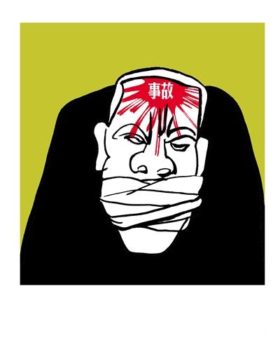 张爱学的漫画《包扎》,演绎了一个事故发生后不该再发生的一个故事。一位被意外事故弄伤头部的工人,得到的紧急救治便是快速的包扎,然而画面最冲击我们寻常视觉经验的是,伤者被包扎的部位不是溅满鲜血的伤口,而是可以用来说话的另一个“口”,这种“包扎”无疑完成了一个医学手段解决不了的问题——封口。