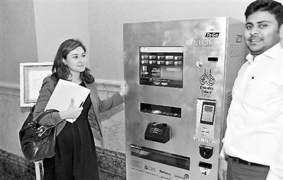5月13日,在阿联酋首都阿布扎比,“黄金ATM机”制造厂工作人员(左)向顾客征求意见。这款被称为“黄金ATM机”的黄金自动销售柜机在阿布扎比酋长国宫大酒店启用,人们可以像操作ATM机一样,从这台柜机里购买24K的纯金金币和金条,而且其金价是根据世界黄金市场金价而自动调整的。 新华社记者 安江 摄