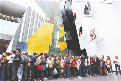 5月15日,游客在意大利馆内排队等待上二楼参观。随着上海世博会渐入佳境,世博客流屡创新高。5月14日入园客流超24万人次,创开园以来最高纪录;15日,截至17时已突破30万人次,再创新高。新华社记者 刘颖 摄