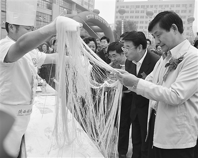 5月15日,在陕西省宝鸡市市民广场,陕西旅游烹饪职业学院的教师展示中华绝技拉龙须面。