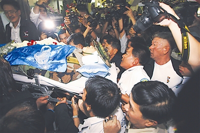 5月17日,在泰国首都曼谷,“红衫军”领导人卡迪亚·萨瓦滴蓬的遗体被运抵一所寺庙。泰国电视台17日报道,13日受伤的“红衫军”领导人卡迪亚·萨瓦滴蓬已经在医院不治身亡。他的葬礼随后在曼谷的一所寺庙中举行。 新华社/路透