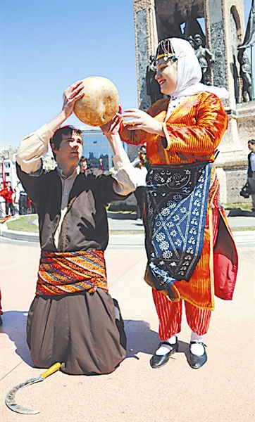 17日,在土耳其最大城市伊斯坦布尔,两名大学生在市中心塔克西姆广场为市民表演小品。当日,伊斯坦布尔市的大学生举行别开生面的青年街头文化节。新华社记者 陈铭 摄